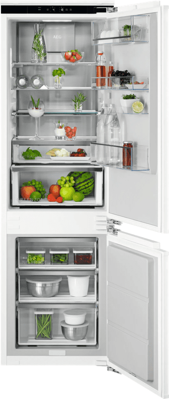 In de AEG TSC8M181BC inbouw koel-vriescombinatie bewaar je je boodschappen langer en energiezuinig. Dankzij de vershoudzone onder in de koelkast blijven je verse tomaten en broccoli langer vers. De koel-vriescombinatie heeft energielabel B. Hiermee bespaar je tot wel € 548,- aan energiekosten over de levensduur van het apparaat. Je verdeelt je boodschappen over de 4 plateaus. Je maakt gemakkelijk extra ruimte voor een hoge pan of ijstaart doordat de plateaus uitneembaar zijn. In het vriesgedeelte bewaar je je favoriete ijsjes, brood en pizza's in de 3 vrieslades. Je kijkt ongestoord naar je favoriete serie terwijl het apparaat je boodschappen koelt. Met een geluidsniveau van 33 decibel hoor je namelijk amper dat deze aanstaat.