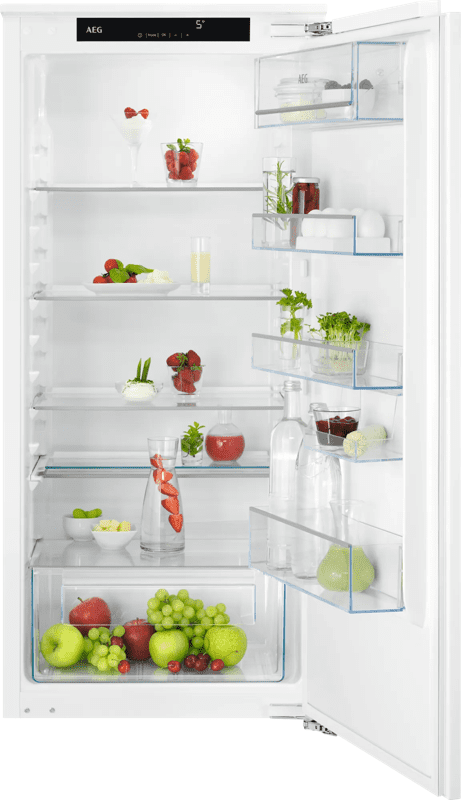 De AEG TSK5O121DF is een inbouw 1-deurs koelkast met deur-op-deursysteem voor een nishoogte van 122,5 centimeter. Je hebt met 203 liter inhoud ruimte voor je wekelijkse boodschappen. Pakken vla, couscous salade en verse tagliatelle verdeel je over de 4 plateaus. Je deelt de koelkast flexibel in dankzij OptiSpace. Hiermee haal je de plateaus er snel uit en maak je ruimte voor een grote pan pastinaaksoep. Zo hoef je minder te proppen en vind je je doosje aardbeien sneller terug. Met het digitale display bovenaan stel je de temperatuur in en zet je superkoelen aan. Na een bezoek aan de supermarkt verlaag je de temperatuur tijdelijk, waardoor je drankjes sneller koud zijn.