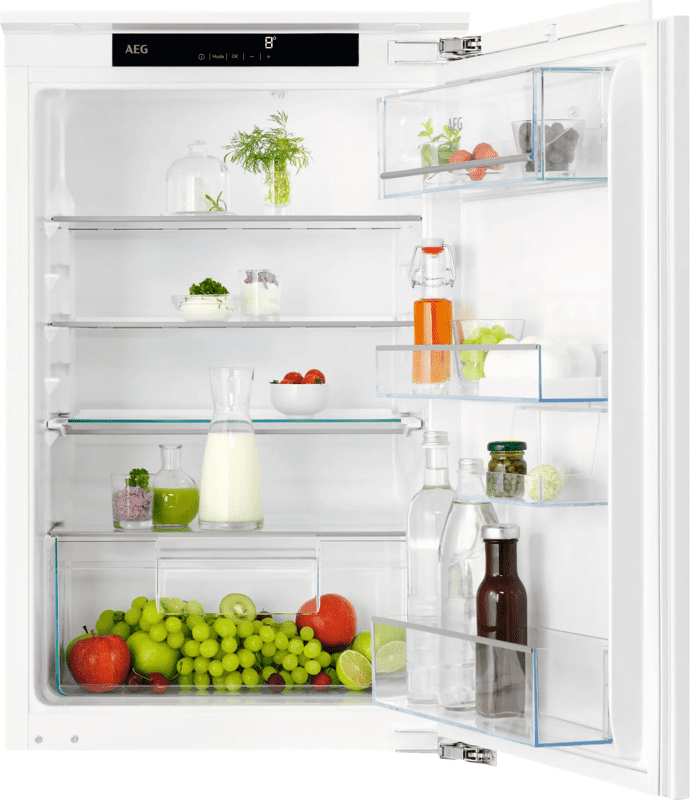 In de AEG TSK5O881DF inbouw koelkast bewaar je je dagelijkse boodschappen. In dit kleinere model creƫer je gemakkelijk veel ruimte dankzij de uitschuifbare plateaus. Zo maak je bijvoorbeeld ruimte voor een hoge pan soep en zet je je pakken melk gewoon rechtop in de koelkast. Onder in de koelkast plaats je je verse groente en fruit in de groentelade. Als je je boodschappen snel wilt afkoelen, kies je voor de superkoelen functie. Hierdoor brengt de koelkast de temperatuur tijdelijk omlaag. Handig, als je boodschappen lang buiten de koelkast hebben gestaan. Waar je het apparaat in huis plaatst maakt niet uit. Met het lage geluidsniveau van 33 decibel, is de koelkast zeer stil.