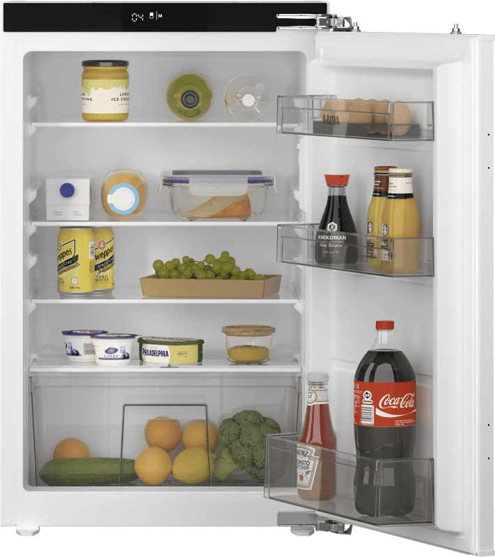 De ETNA KKD7088T inbouw 1-deurskoelkast heeft een inhoud van 126 liter. Dat is genoeg ruimte voor je dagelijkse eten en drinken. Op de 3 plateaus leg je gemakkelijk je kaas, hummus, bakjes vla en salades. Heb je een grote pan met pastasaus of een fles melk die rechtop moet staan? Schuif de verstelbare plateaus dan een stukje hoger of lager. Onderin zit een speciale lade voor groente en fruit. Je past zelf de luchtvochtigheid aan, zodat je komkommer, perziken en bosuitjes langer vers blijven. Dankzij het lage geluidsniveau van 32 decibel heb je geen last van geluid. Je bouwt hem dus ook in een open keuken in.