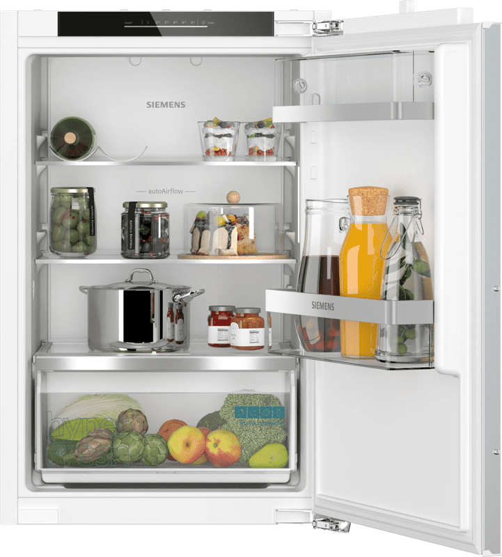 Je hebt geen last van geluid met de Siemens KI21RADD1 inbouw koelkast. Met een geluidsniveau van 28 decibel hoor je amper dat hij aanstaat. Druiven en broccoli blijven langer vers in de vershoudzone. Je past hier de luchtvochtigheid aan, waardoor je groente of fruit langer bewaart. Met een inhoud van 136 liter heb je plek voor een kleine lading boodschappen. Je legt deze op de 2 plateaus, in de vershoudzone en 2 deurvakken. Heb je net boodschappen gehaald? Gebruik dan de superkoelen functie, zodat je de koeltemperatuur tijdelijk verlaagt. Als je de koelkast sluit, gaat de deur zachtjes dicht dankzij softClose. Hierdoor hoor je geen flessen rammelen.
