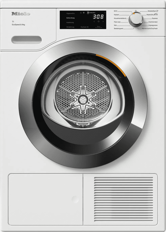 De Miele TEH 788 WP EcoSpeed & Wash2Dry is een ruime en snelle warmtepompdroger. Je droogt een volle trommel met 9 kilogram vulgewicht in 184 minuten, wat net iets meer is dan 3 uur. Dit is vrij snel voor een A+++ droger met zoveel ruimte. Je stemt het droogprogramma af op de instellingen van je wasprogramma dankzij Wash2Dry. Hiermee koppel je je warmtepompdroger aan je wasmachine en heb je meer gemak. Zodra je beddengoed droog is, stopt het programma automatisch dankzij PerfectDry. Hiermee verbruik je niet meer energie dan nodig is en blijft je was langer mooi. Met een geluidsniveau van maximaal 64 decibel heb je weinig last van lawaai. Ook handig is dat je allergenen, zoals pollen, verwijdert met HygieneDry.